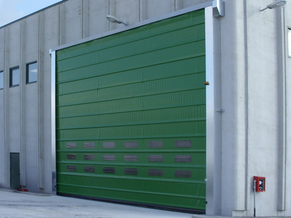 Simple construction and robust design with reinforced galvanised steel. The door curtain is fitted with horizontal reinforcements at a regular interval. Fold up doors are resistant against weather and high wind pressure.